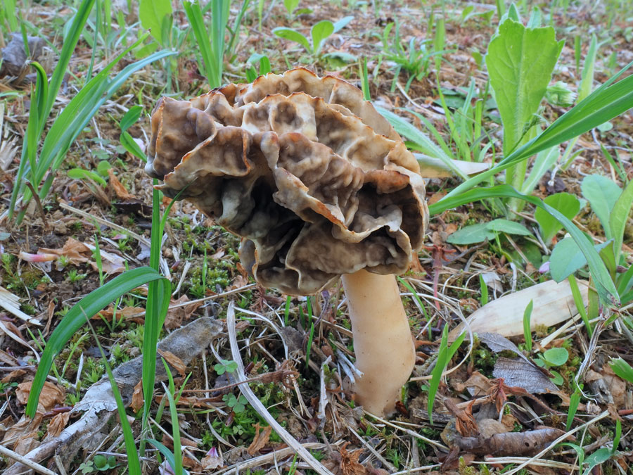 発生しそうなポイントは数多くあったが、アミガサタケは全く見つけられない。ようやく1個見つけたが状態は良くなかった。それでもアミガサタケが発生する場所であることはわかったので、さらにしつこく探していると、このアミガサタケが見つかった。