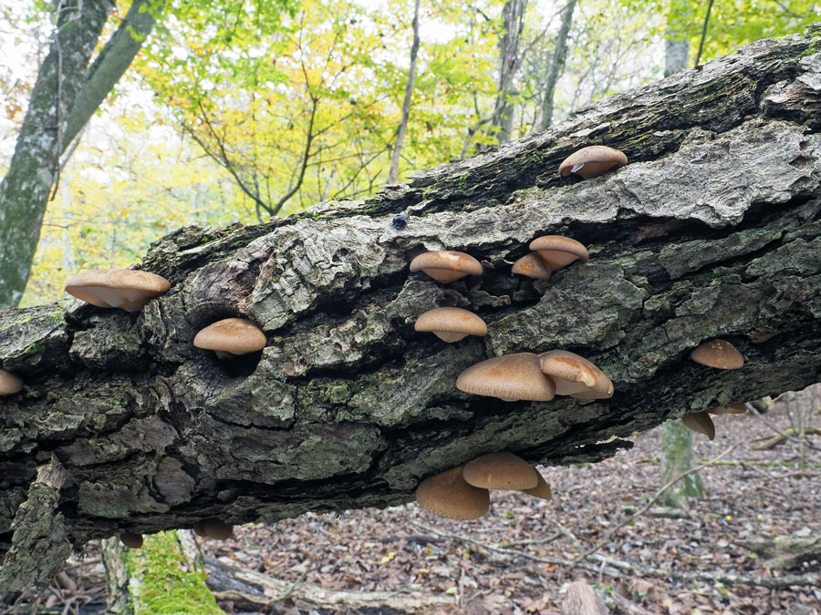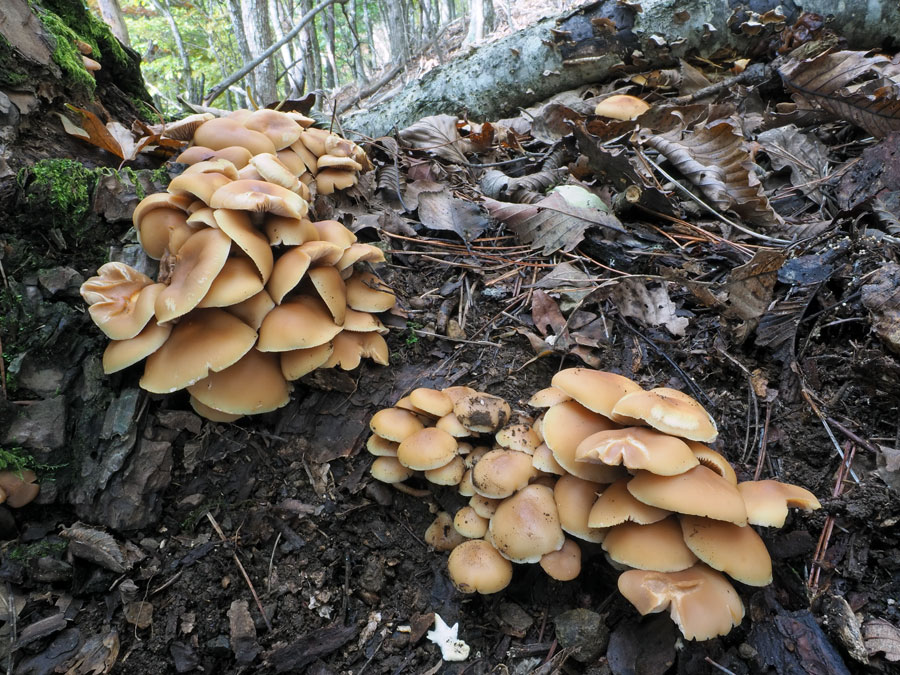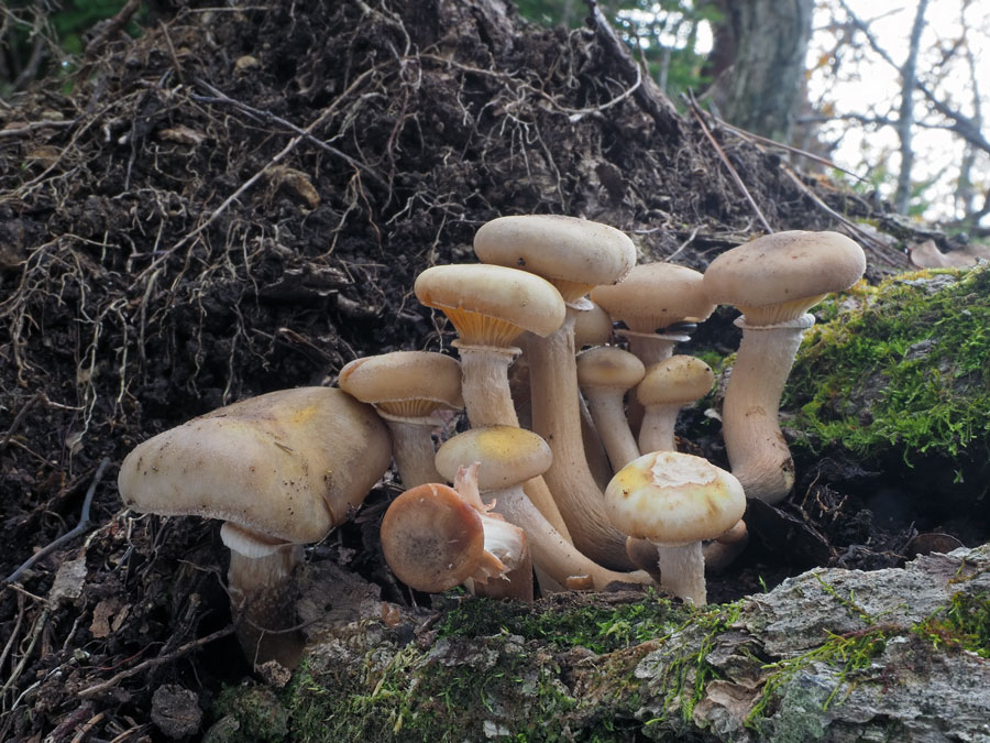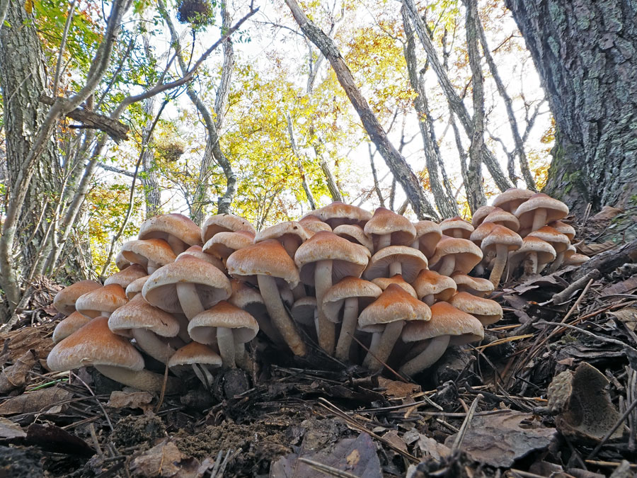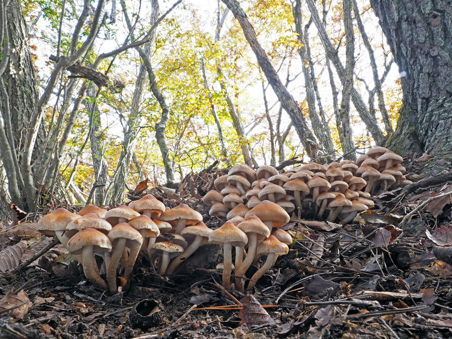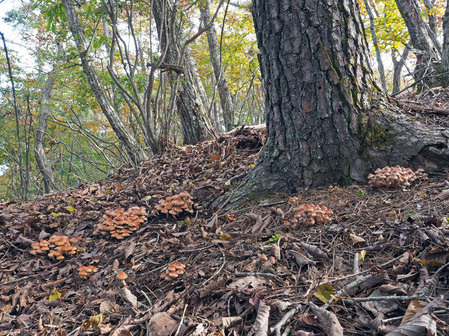 尾根から斜面の下を見ていると群生が見えたので、ナラタケかと思って下りて確認すると本種だった。