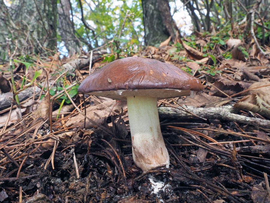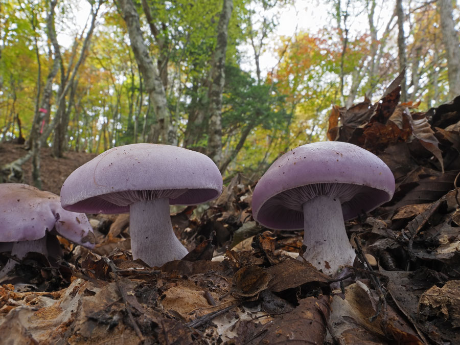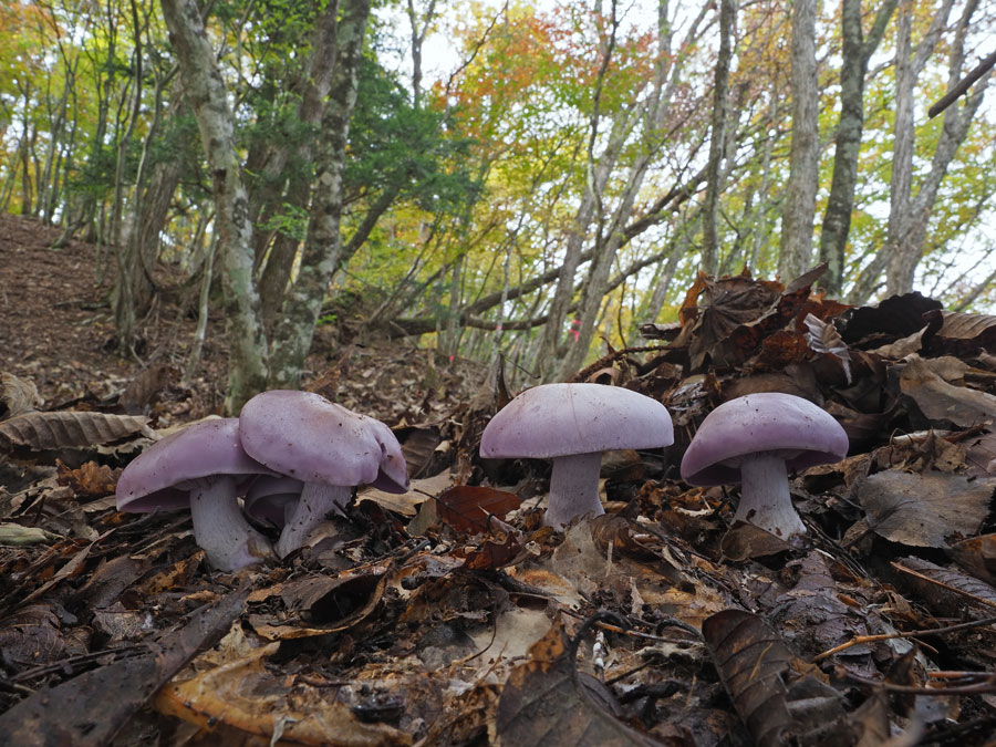 遊歩道脇に紫色の頭を発見。落ち葉をかき分けると本種がたくさん現れた。傘の上に付いた落ち葉のゴミを掃除するのが大変だったが、本種は滑りがないのでかなり綺麗に取り除くことができた。