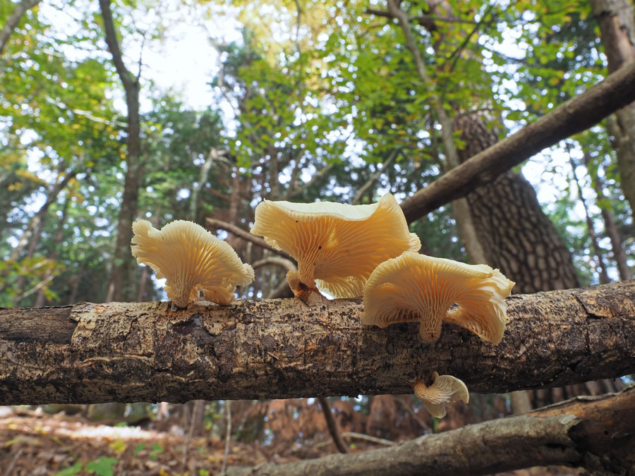 山の気温はかなり下がっており薄いジャンパーを着てちょうどよいくらいだった。これではさすがにキノコも少なく、歩き出してしばらくは小型の不明菌くらいしか見つからなかったが、遊歩道脇に転がっていた細い倒木に発生している本種を見つけた。独特な芳香があり本種とわかった。