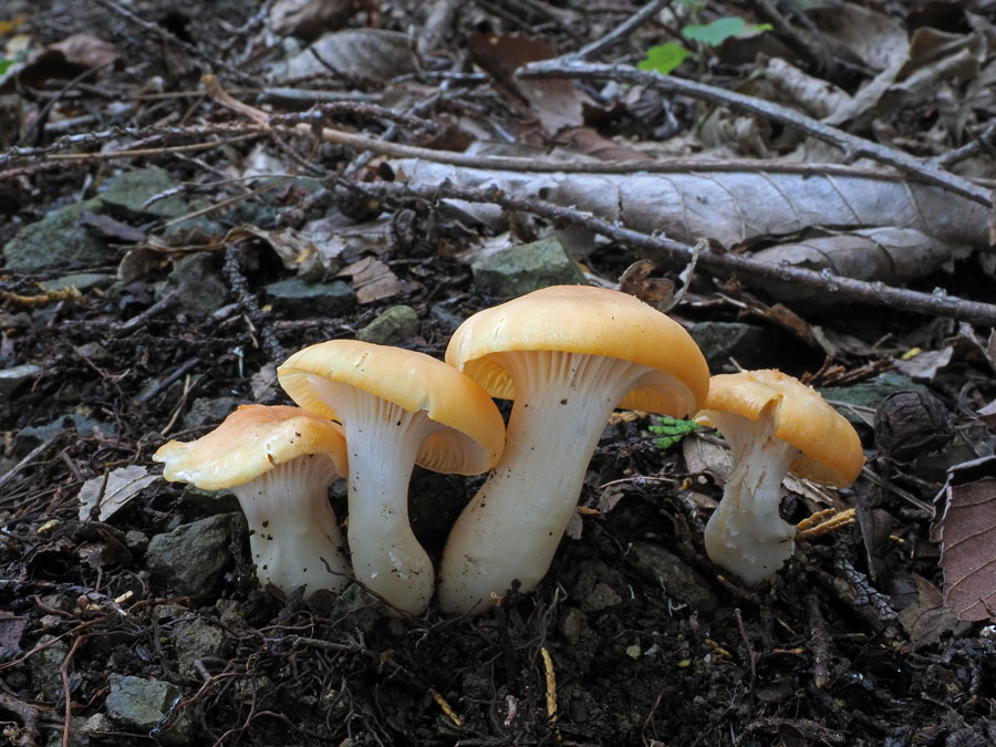 キノコの発生があまり期待できないヒノキ林を見ていると橙色の傘が見えた。斜面を下りて確認すると本種だった。