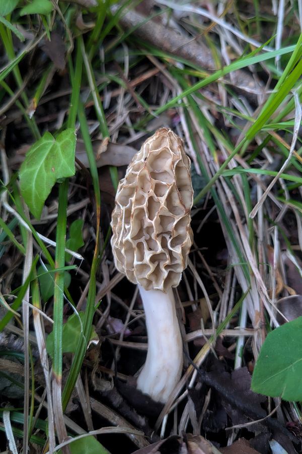 もうこのポイントは発生しないと諦めていたが、今年は雨も適度に降っていることから「もしかしたら」と思い見てみることに。すると草むらからアミガサタケの頭がわずかに見えたので近寄ってみるとこの個体があった。カメラは持ち合わせていなかったのでスマートフォンで撮影。